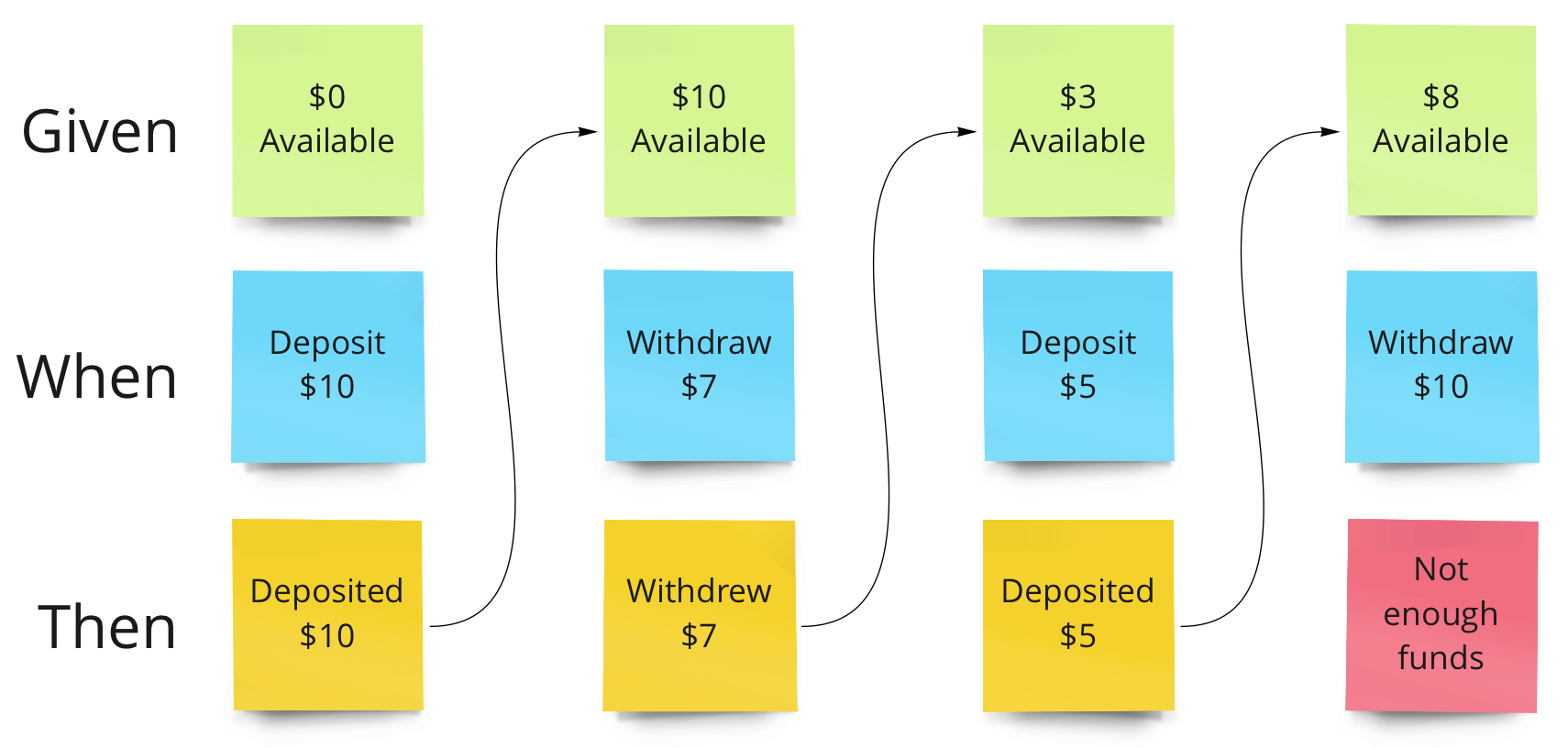 The above diagram is one way to demonstrate the Given-When-Then relationship between the state, command, and event using only the available balance for simplicity. This can be read as "given $0 available, when a deposit of $10 occurs, accept that $10 were deposited". Notice the produced event is fed back into the state for when the next command is received.