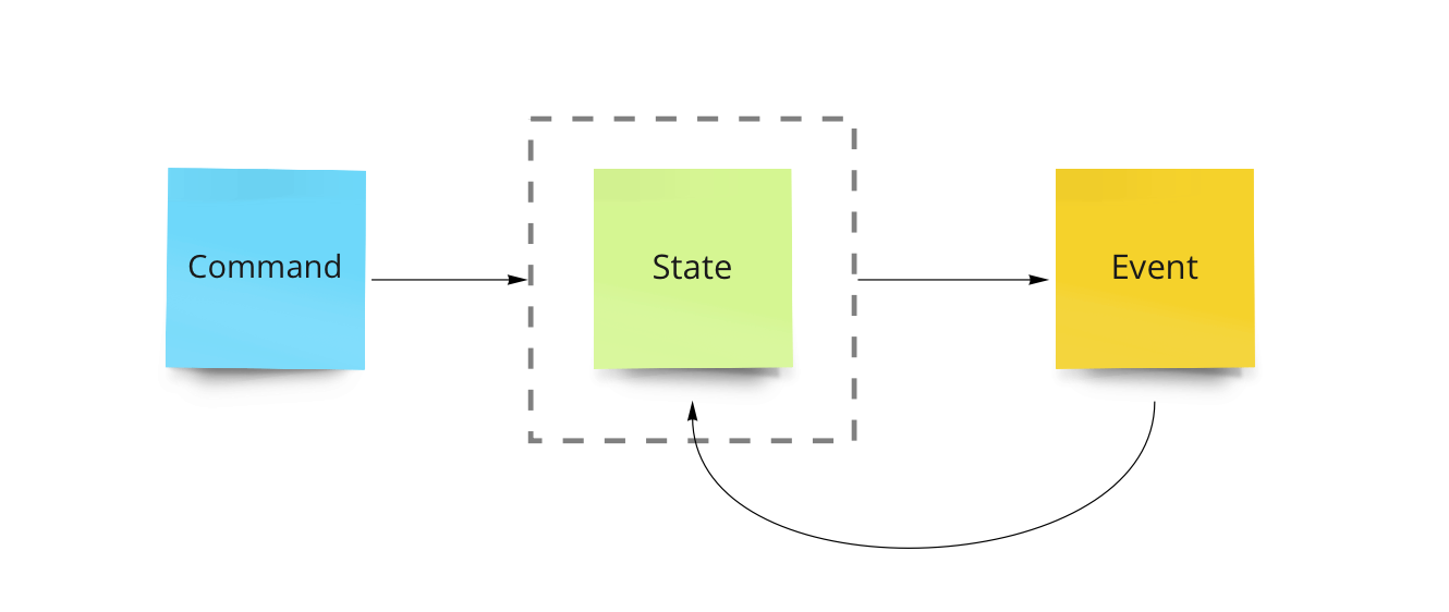 In practice, events don't exist in a vacuum. There is always an action that results in an event. We define commands as an intention to perform an action. Likewise, as events occur, we can derive information from these events in order to build up the state necessary to evaluate the next command.